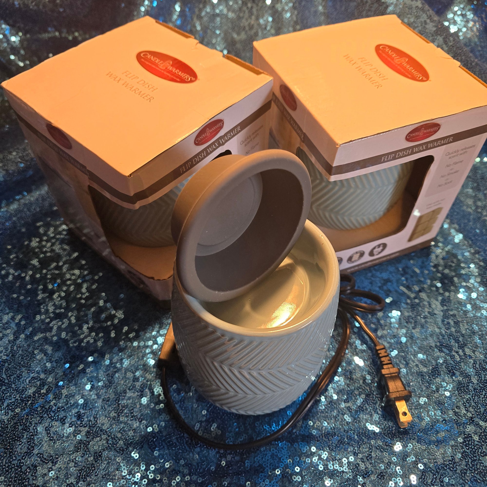 Flip Dish Wax Warmer- Blue Herringbone design. Long plugin cord with switch. Regular Price $26.00.